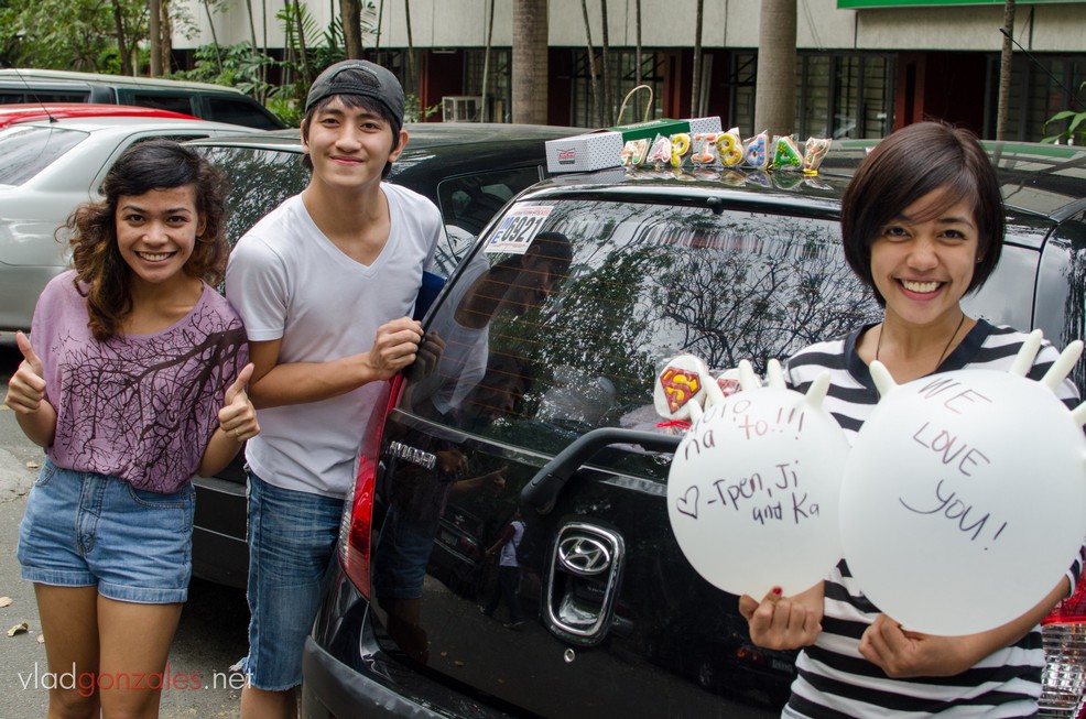 Pagkababa mula sa CAL building, si Tpen naman ang nakasalubong ko, hinatak ako sa parking lot. May surpresa daw sila, basta tumingin ako sa may itaas ng Palma Hall. Niloloko lang pala ako ni Tpen kasi nasa parking lot pala ang surpresa–ang kotse kong may mga letter cookie na bumabati ng “Happy Bday Ser!” Sina Ji-ann at Karen naman ay nandoon din, may hawak na improvised na lobo mula sa plastic gloves. Unang beses yatang may nagsurpresa sa akin nang ganoon sa buong buhay ko sa UP. Dumating din si Jules, nagpichur-pichur kami. Matamlay daw ako sabi ni Karen, sabi ko e kasi may meeting na nag-aabang sa itaas, na medyo pagod sa pagtuturo at medyo asar kahit paano na kailangang magtrabaho at piniling magtrabaho sa anibersaryo ng kapanganakan. Nagpaalam na ako sa kanila at umakyat muna.