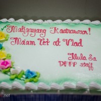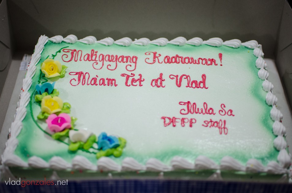 Pagdating sa taas, may dagdag na surpresa, isang cake mula sa mga katrabaho ko sa Departamento. Nakakatuwa, kasi bihira silang nagreregalo sa kahit sino. Feeling special tuloy ako at ang aming tagapangulong nag-birthday naman noong nakaraang araw. Dumating din ang co-host ko sa aming radio show at dating teacher na si Ginny, may regalong masarap na higanteng mango tart. Bago magsimula ang meeting, dumating si Ser Bomen at inabutan ako ng cute na cute na tasang mukhang lente ng Nikon. Medyo nainis siya na nahulaan kong hindi siya tunay na lente, pero natuwa ako nang sobra kasi yung focal length ng pekeng lente e sakto sa pinapabili ko sa kanya noong binubully ko siya.